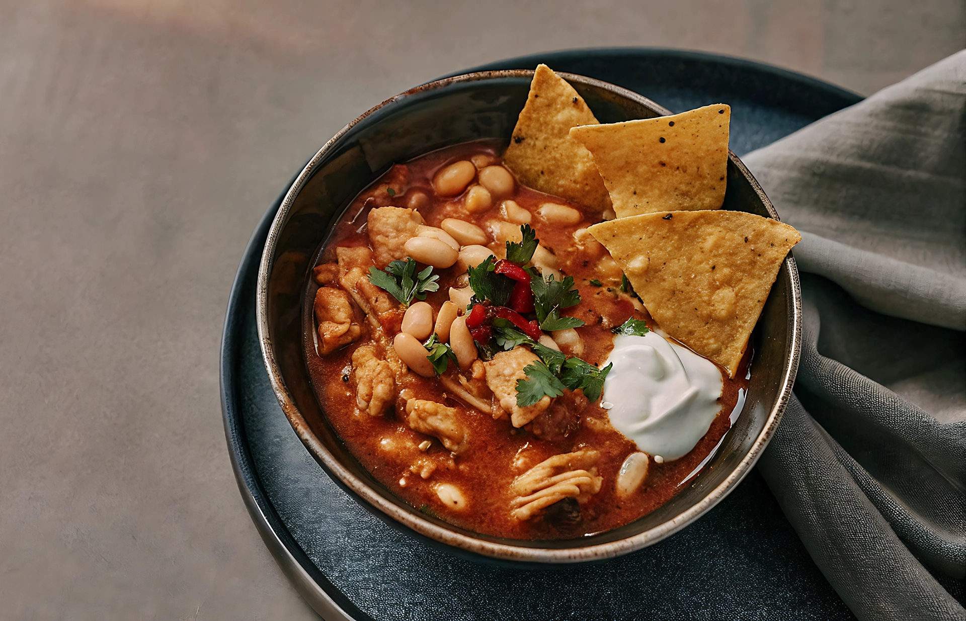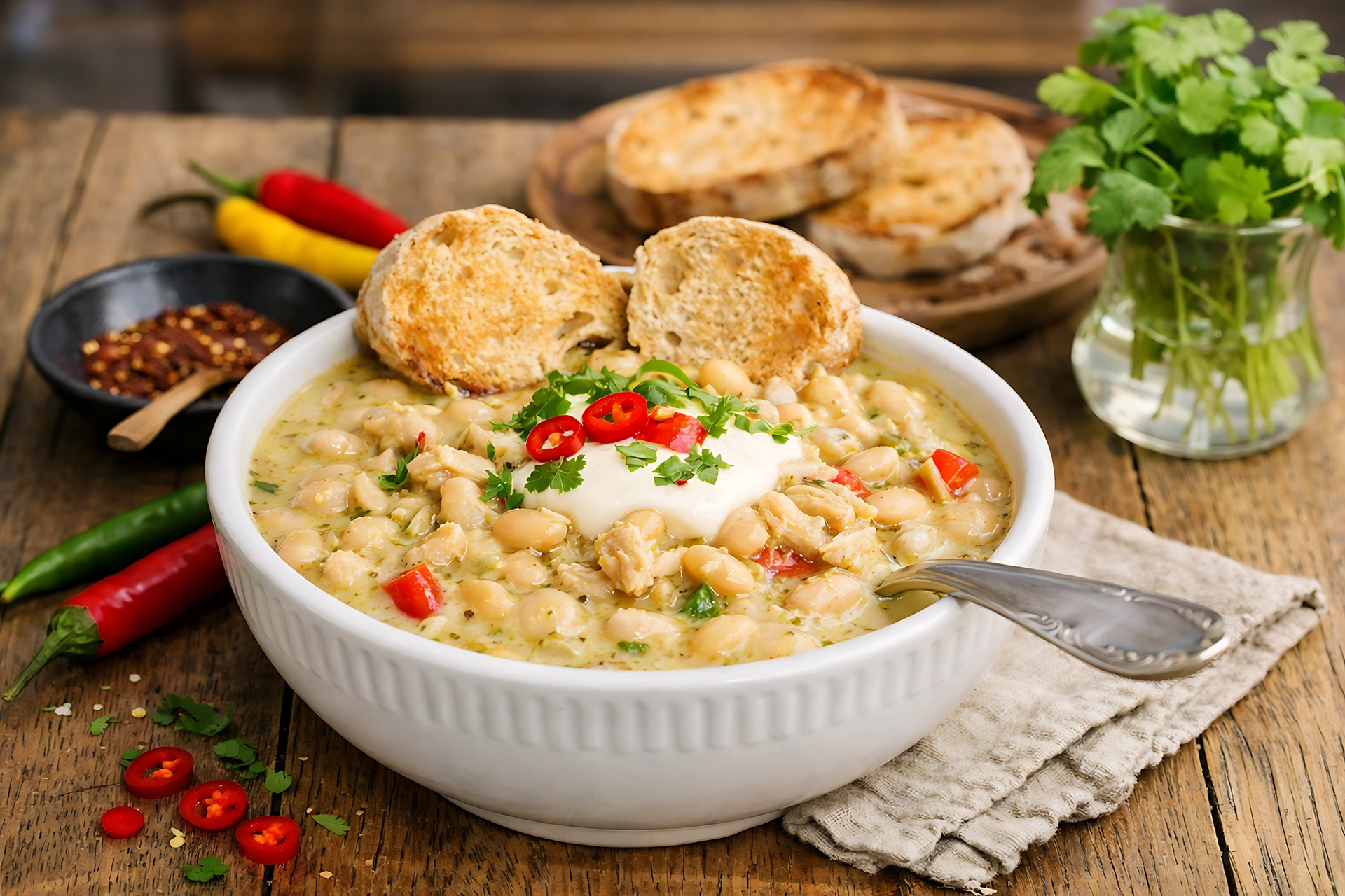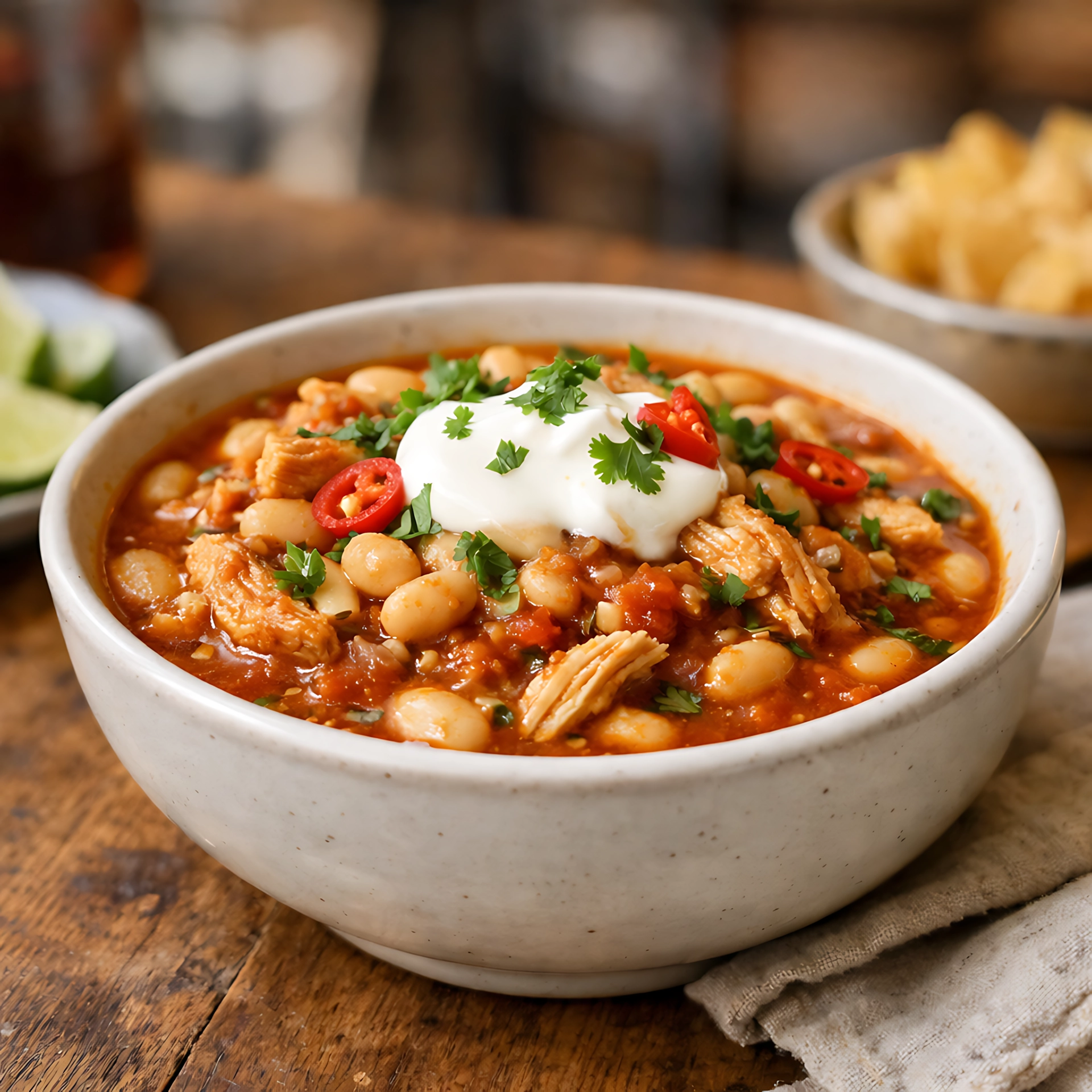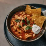 Aunque el chili tradicional tiene raíces profundas en la frontera entre México y Texas, el chili de pollo con frijoles blancos es una evolución moderna que ganó popularidad en los Estados Unidos durante la década de los 80. A diferencia de su primo hermano, el «chili con carne» rojo, esta versión prescinde del tomate y la carne de res, optando por una paleta de colores crema y verde que visualmente invita a una experiencia más delicada. Es un plato que simboliza la fusión culinaria: la técnica del guiso europeo combinada con los ingredientes autóctonos de América, como el chile y el frijol.