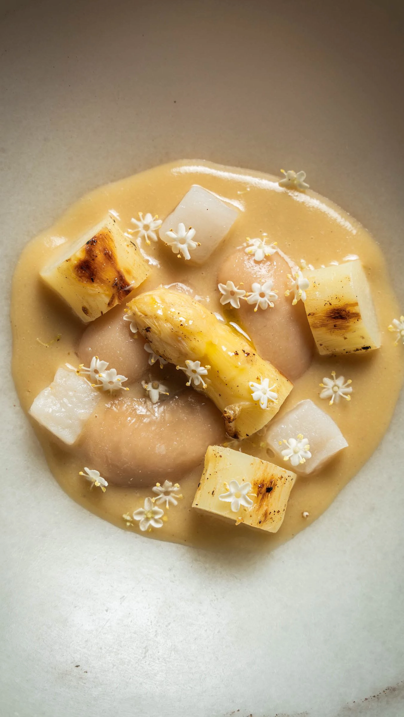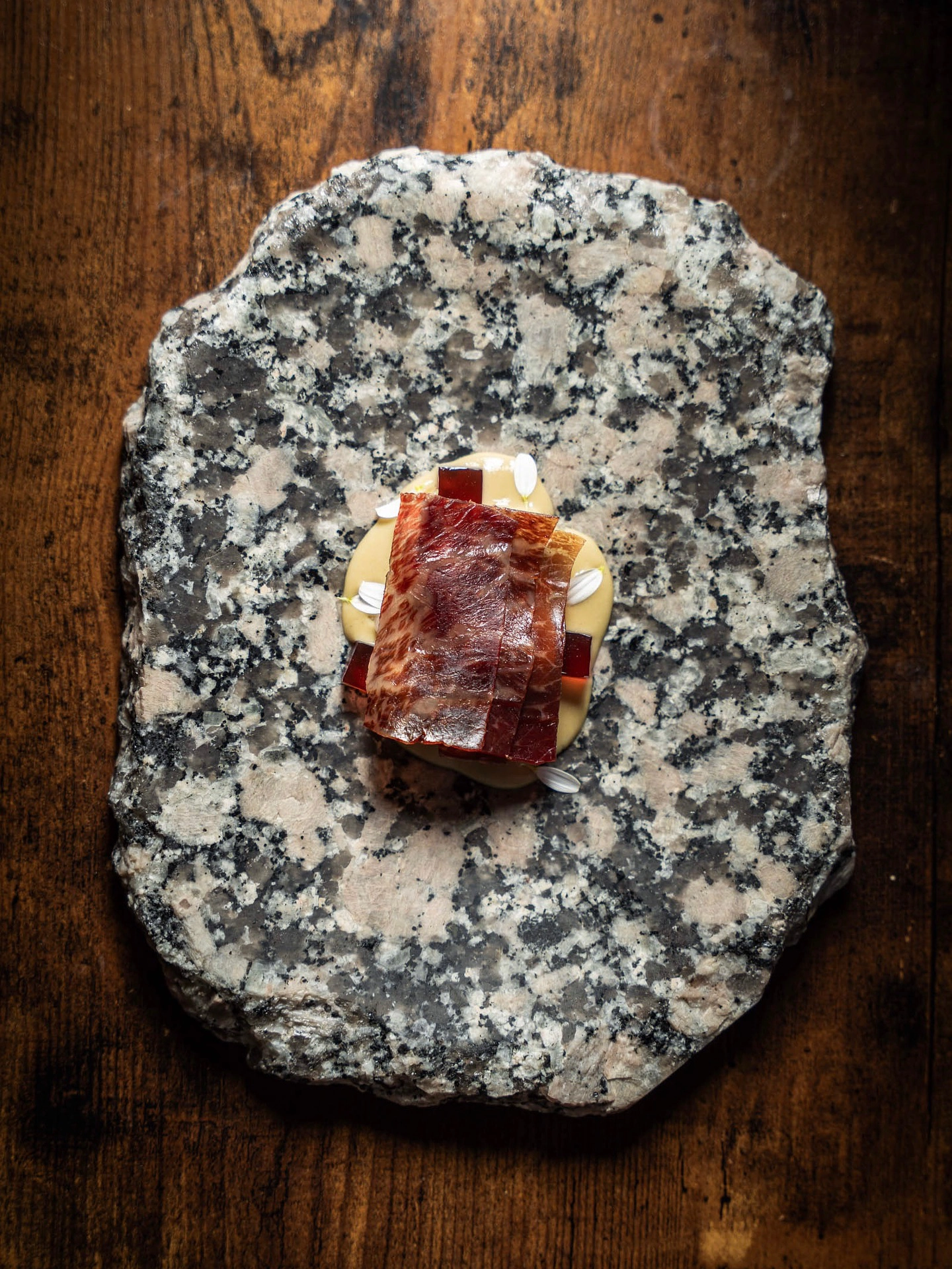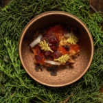 Durante mi experiencia probé el menú de otoño (Ouros) y confirmé que se trata de una alta cocina elaborada. Los platos son creativos y técnicos: por ejemplo, una brandada de bacalao en tartaleta con miso picante, o un salmorejo de tomates asados con helado de pimiento y anguila ahumada. Hay influencias ibéricas mezcladas con toques internacionales (la crítica gastronómica destaca matices latinos y orientales en la propuesta). La ejecución es impecable, con ingredientes de primer nivel: es fácil imaginar jurel o mantarrayas de pesca sostenible convertidos en bocados memorables. Además, la filosofía es claramente sostenible: Èter apoya productores locales, trabaja con productos de temporada y cuida el medio ambiente en su menú.