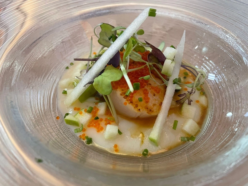 - Carpaccio de gambas con vinagreta cítrica, fresco y delicado.