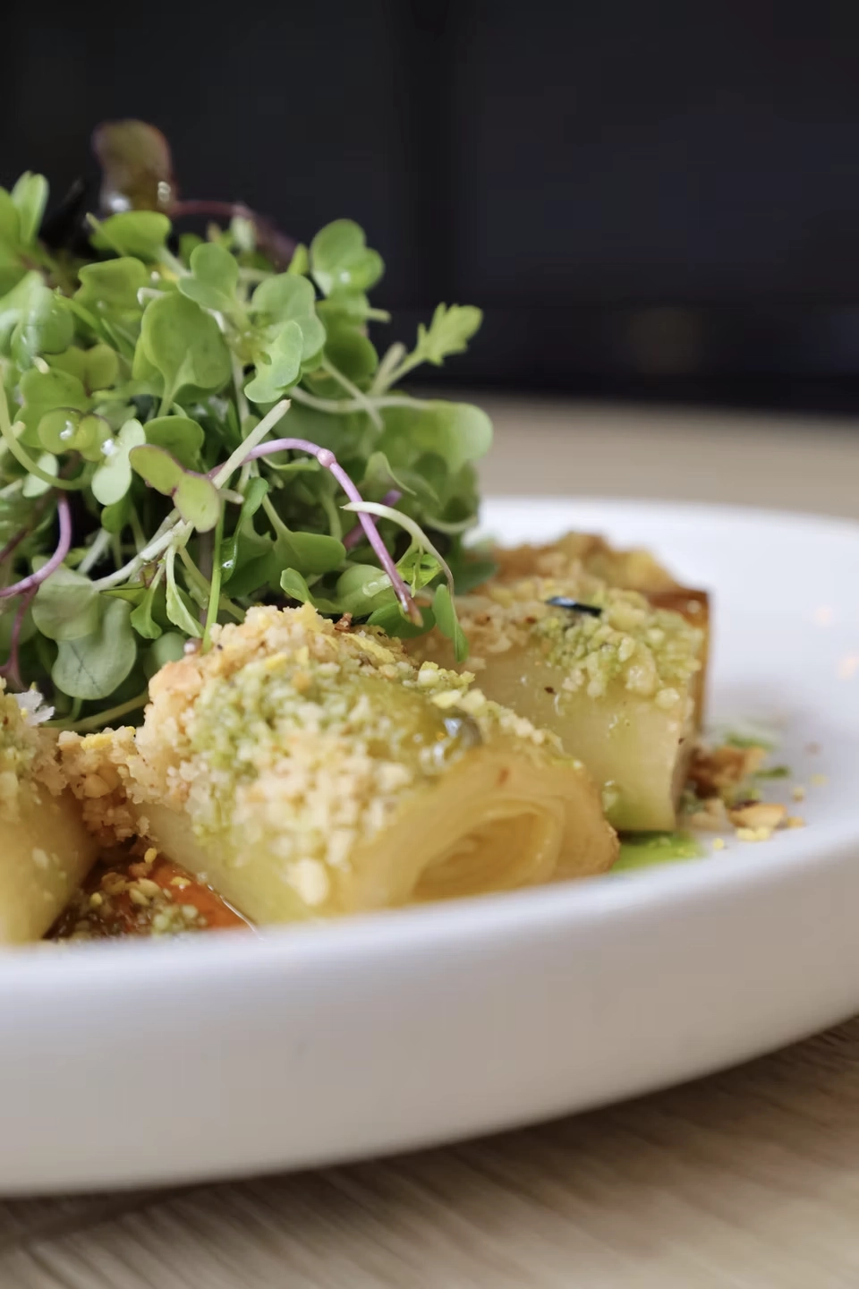 - Puerros confitados con salsa romesco y avellana, un ejemplo de técnica y sabor perfectos.